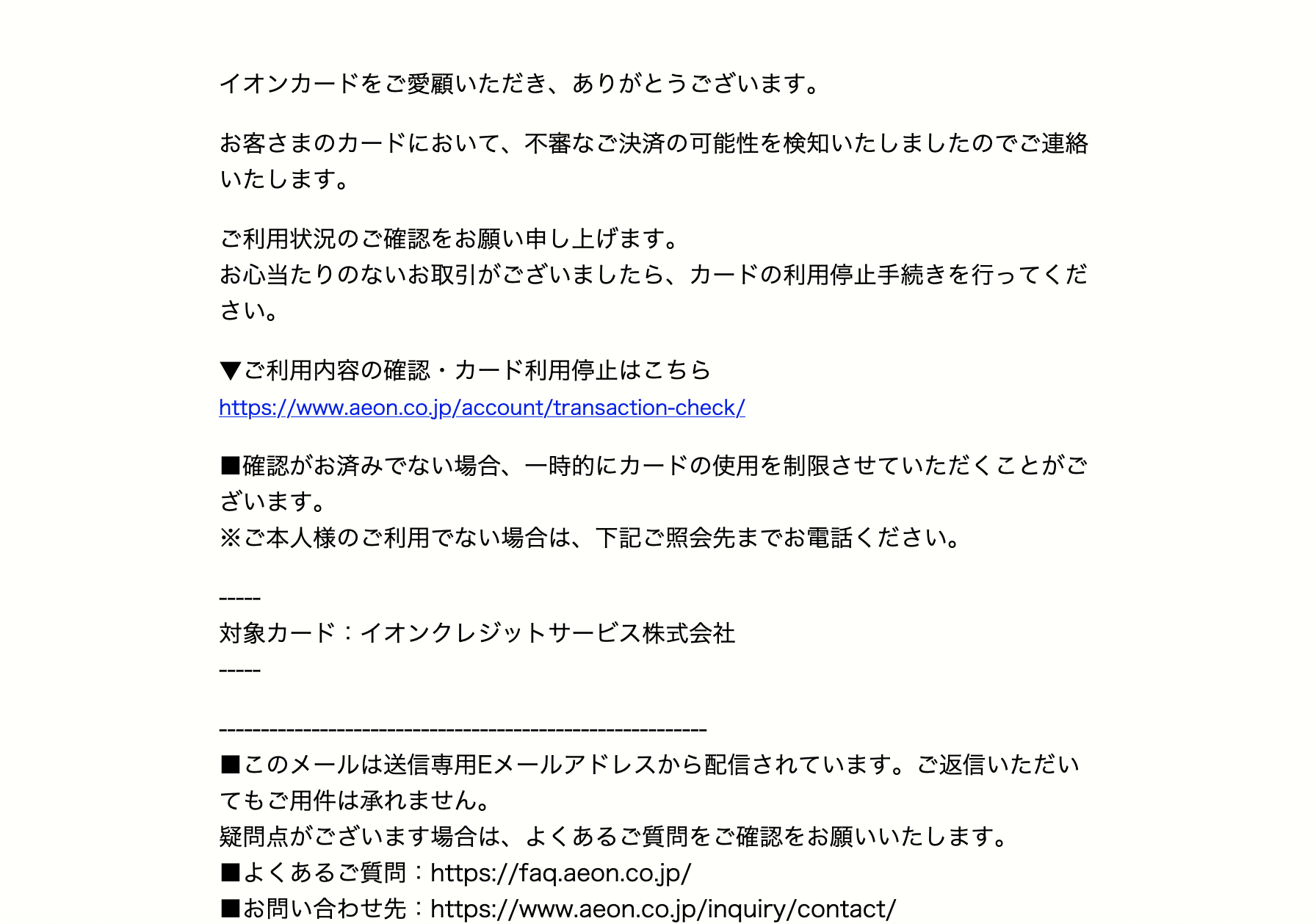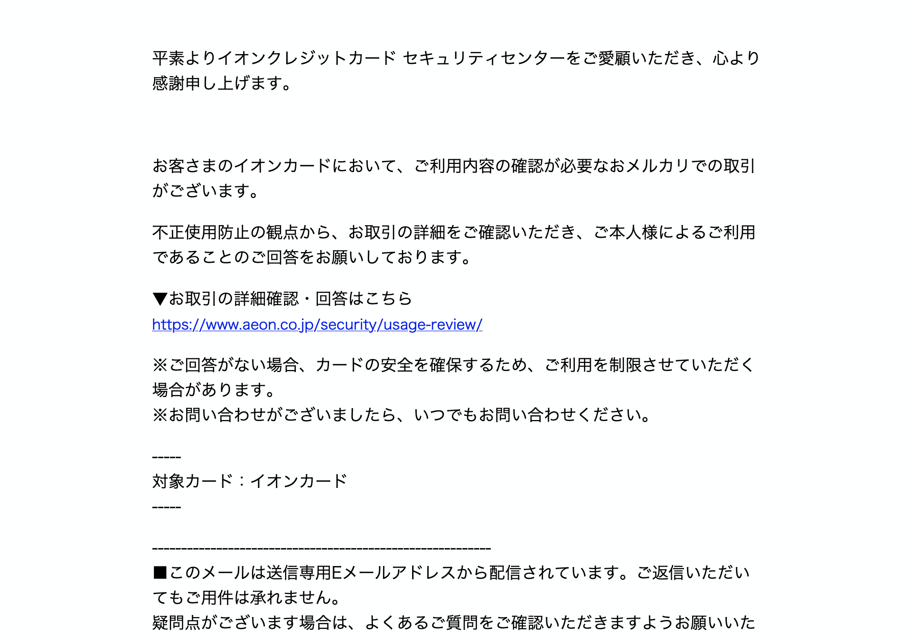 2026年 4月 6日にイオンを騙る詐欺メールが学内のメールアドレスに送信されてきていることを確認しました。サンプルとして一部を示します。