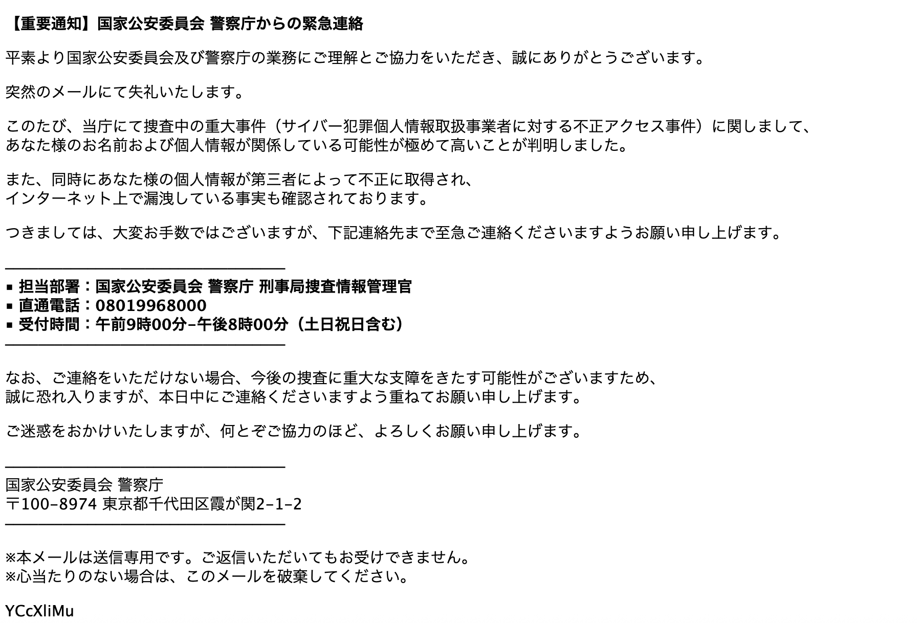 2026年 4月 6日に警視庁を騙る詐欺メールが学内のメールアドレスに送信されてきていることを確認しました。サンプルとして一部を示します。