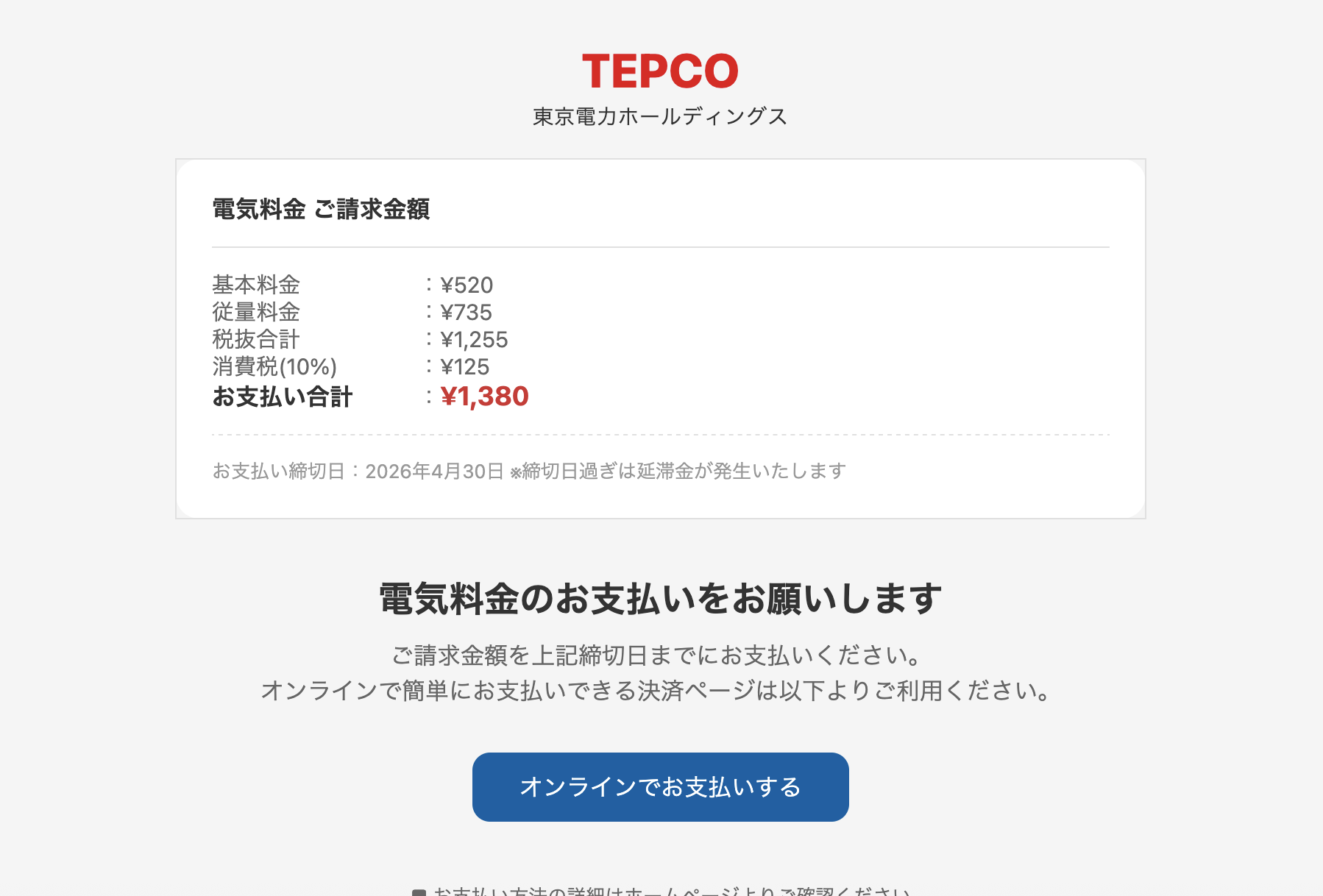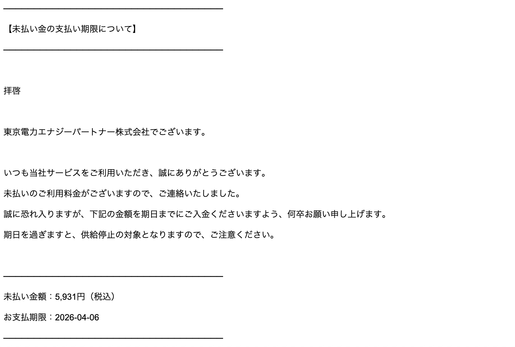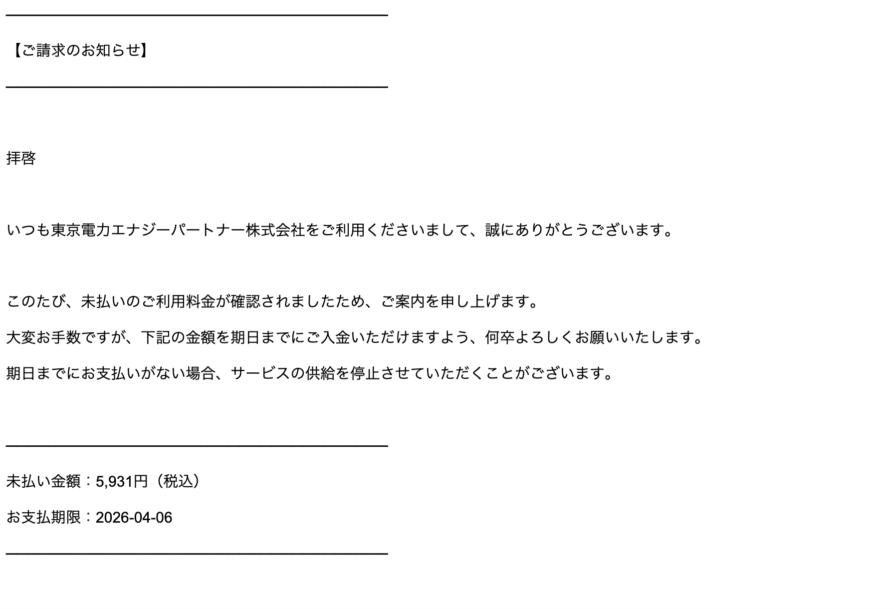 2026年 4月 6日に東京電力を騙る詐欺メールが学内のメールアドレスに送信されてきていることを確認しました。サンプルとして一部を示します。