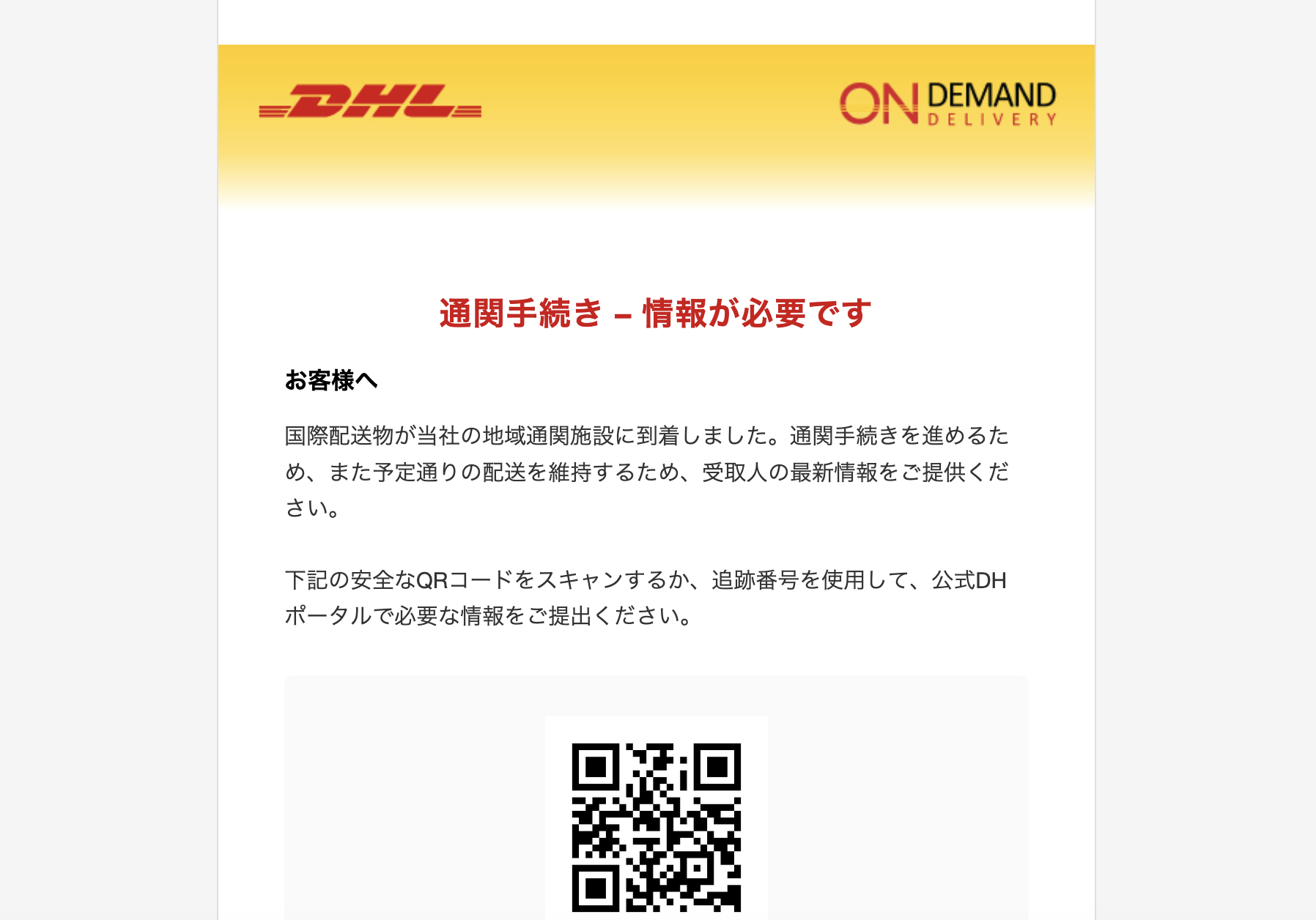 2026年 4月13日にDHLを騙る詐欺メールが学内のメールアドレスに送信されてきていることを確認しました。サンプルとして一部を示します。