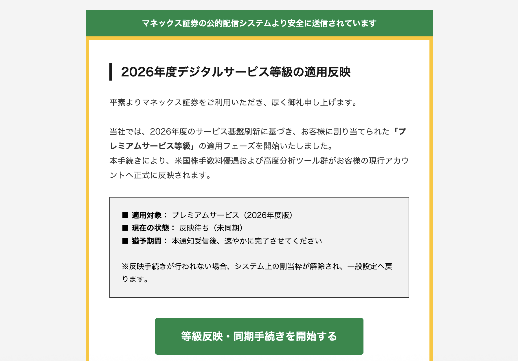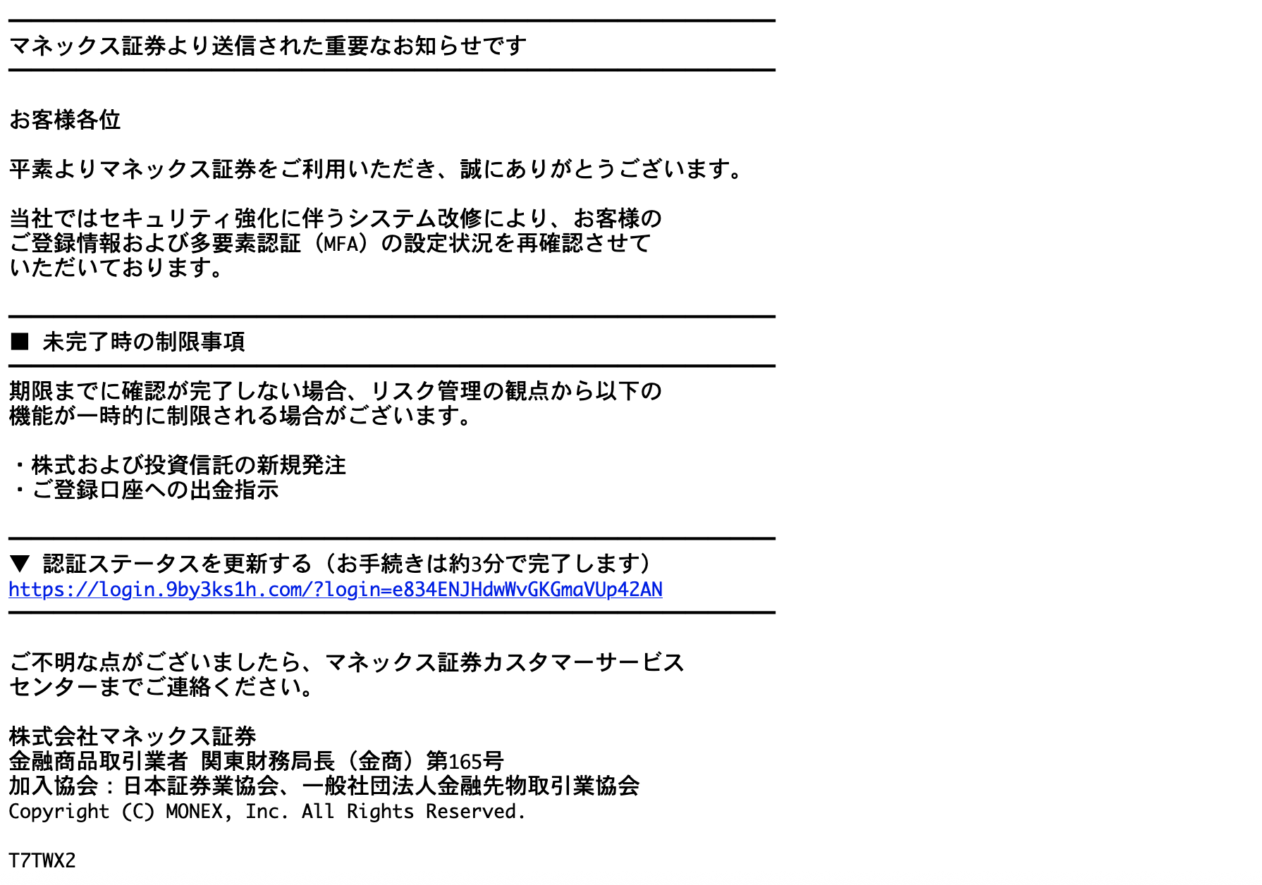 2026年 4月13日にマネックス証券を騙る詐欺メールが学内のメールアドレスに送信されてきていることを確認しました。サンプルとして一部を示します。