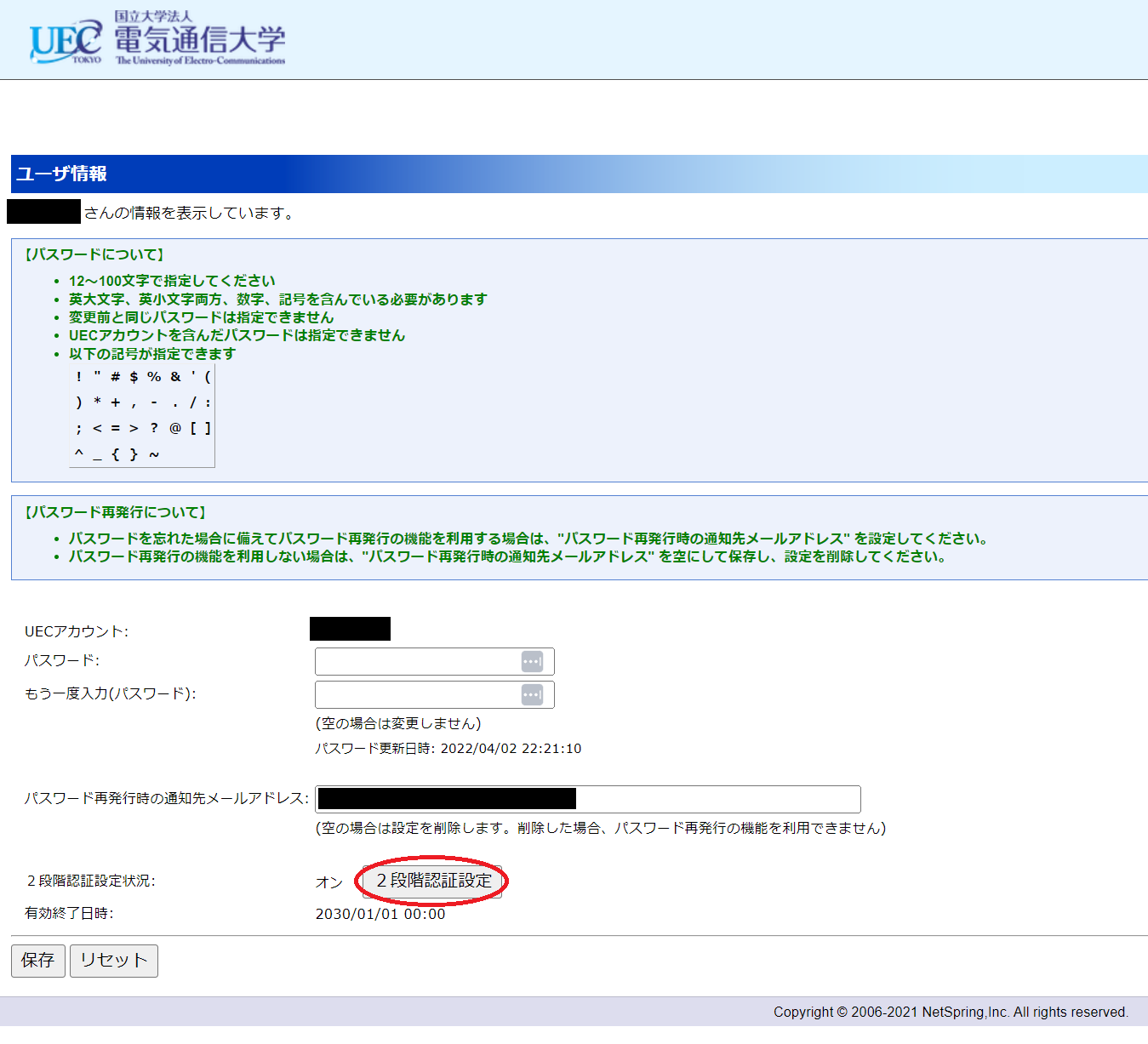期日を過てしまった場合は, UEC アカウントのパスワード再発行 をしてください.