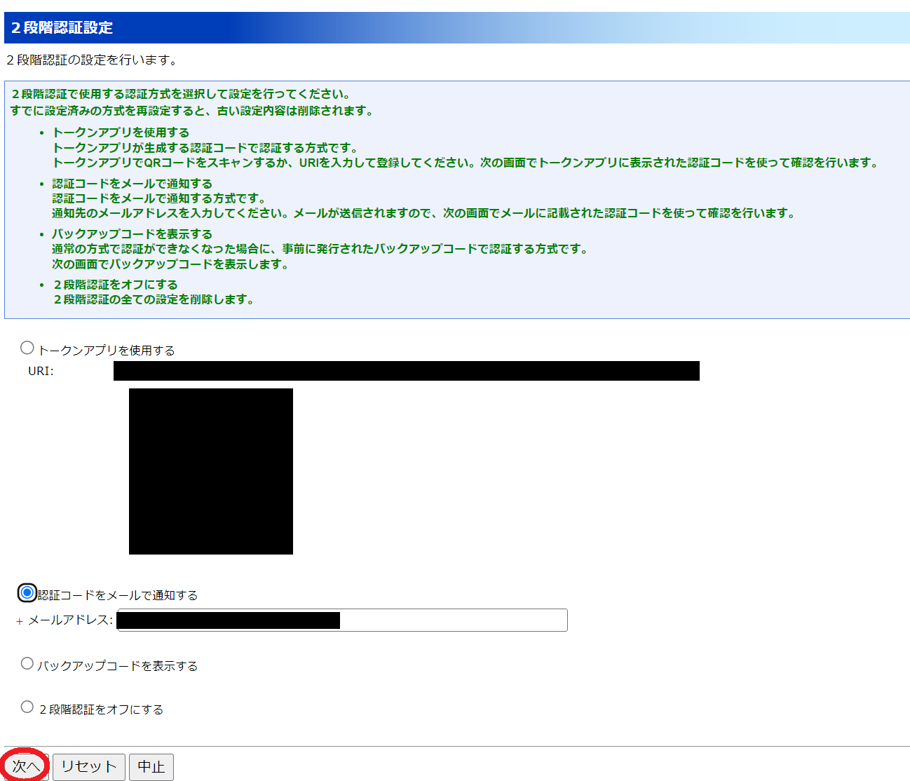 次へ をクリックし,メールで通知されたコードを打ち込み設定を完了する.